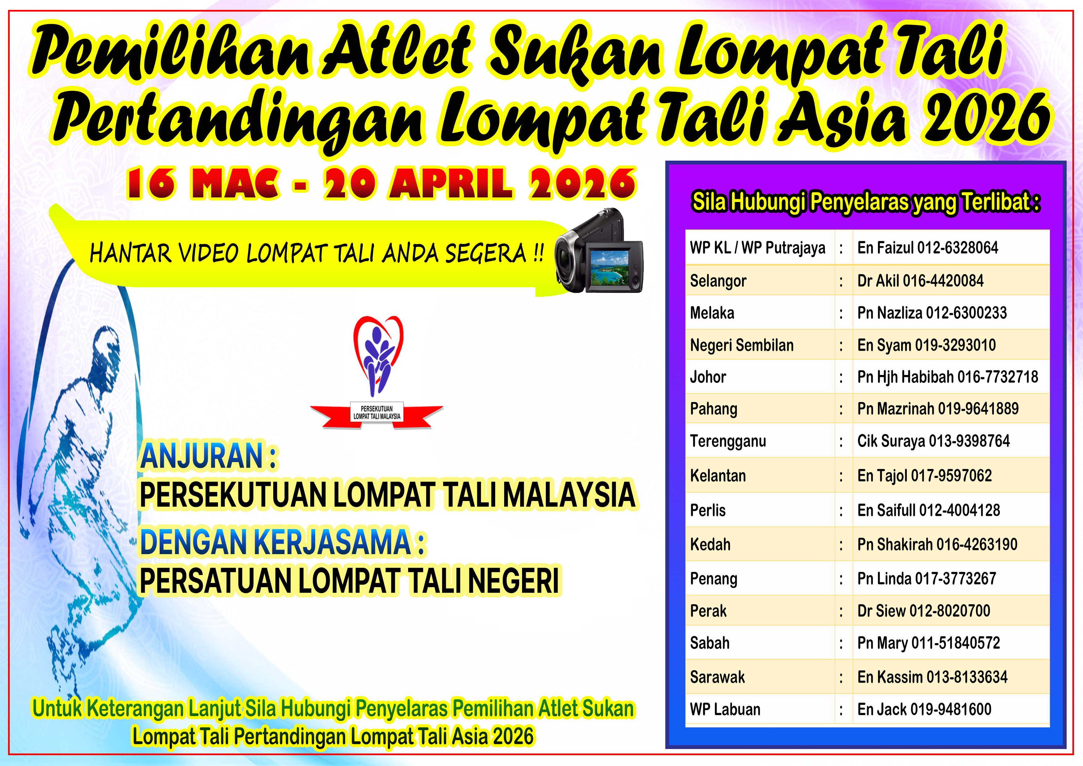 PEMILIHAN ATLET SUKAN, SUKAN LOMPAT TALI KE PERTANDINGAN LOMPAT TALI ASIA 2026 Berminat untuk menjadi Atlet Sukan Lompat Tali Malaysia?? Jom sertai Pemilihan Atlet Sukan